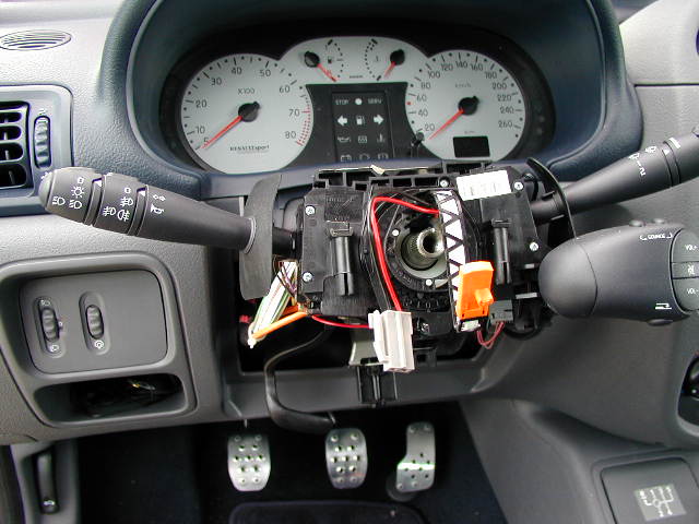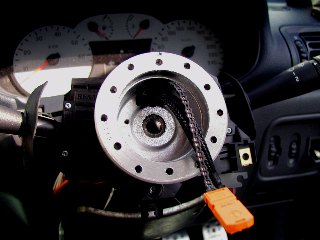 これがステアリングを取り外した画像です。(画像をクリックすると拡大します) RSのこの部分と比べてみてください。 エアバッグ・ホーンスイッチのケーブルの形状などが違うのは構わないとして、ここで問題になってくるのはウィンカーリテーナーの形状の違いです。 RSのように簡単には取り外せませんし、自作リターンピンが引っかかるような突起部もないのです。 しかし、あきらめずにノギスをあてて、あれこれと採寸してみると。。。。。 なんと、このリテーナーは、例のボスの内径部を削るだけで使えることが判明しました。 むちゃ、ラッキーです。 |
