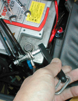 アーシングケーブル端子がブラブラ自由に動くようになったら(完全に取り外してもオッケー)ターミナル固定金具を8mmソケットレンチで緩めます。 |
