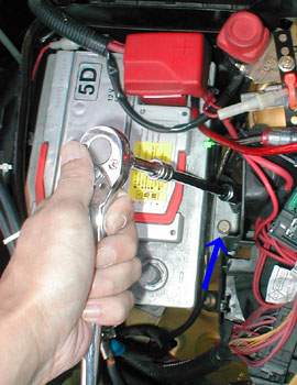 マイナスターミナルからターミナル金具を取り外します。邪魔にならないところへひっかけておきましょう。 知らぬ間にターミナルに接触して通電していたら作業中非常に危険ですので。注意には注意を重ねて。以降の作業中は遠くの方へガムテープなどで固定しておくのがベストです。 写真右よりの青矢印で示したバッテリー本体固定用のボルトを緩めます。レンチのサイズは13mm。 かなり深いところにありますが、ラチェットのセットのエクステンションバー長・短をつなぎあわせれば丁度届く程度ですね。 |