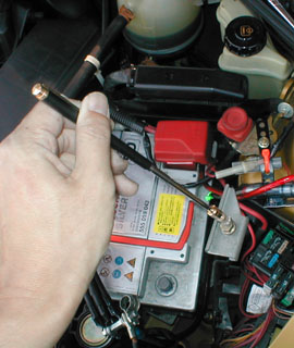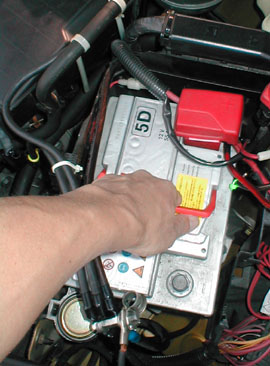 プラスのターミナル金具を取り外すため工具を入れる空間を確保するためにバッテリーを手前に引っ張り、数センチ移動させます。 |