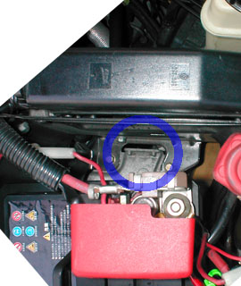 取り外した逆の手順で、まずはバッテリープラスターミナルを取り付けます。 取り付ける際には導電グリスか接点復活剤をプラス・マイナス両方のターミナルに塗布することをお勧めします。 プラスターミナルを固定したら、バッテリー本体を所定の位置に設置します。写真の青丸の中央をご覧下さい。 |