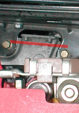 クローズアップした画像です。 この金具にバッテリーの最後端が接触する位置に設置します。 (赤い線の位置まで) 位置が決まったら、バッテリー固定金具をボルトで固定します。 バッテリーマイナスターミナルを固定します。 アーシングケーブルを固定します。 この時ついでに端子類の脱脂洗浄と接点復活剤塗布などのメンテナンスも同時に行うといいでしょう。 |