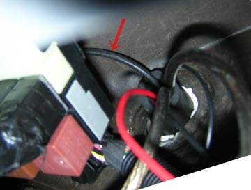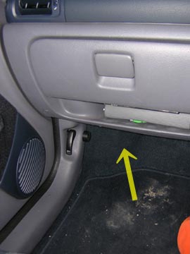 私はボンネットオープナーワイヤーが通ってる経路を利用して電顕ケーブルを車内へひきこんでいます。 場所は左写真の黄色矢印の奥・上方です。 肉眼で見るためには助手席足元に寝っころがって首を不自然にねじり、上を見上げる必要があります。 充分に首の柔軟運動をしてから行わないと寝違え状態になりますのでご注意。 |