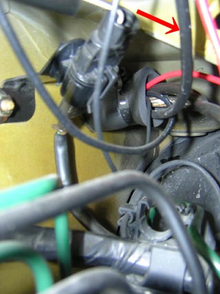 見上げると、この様になっています。赤矢印で示しているのがボンネットオープナーワイヤーです。 オリジナルの状態ですと、このオープナーワイヤー1本がこの位置にある極厚ゴムグロメットを介してエンジンルームへバルクヘッドを貫通しています。 私はこのグロメットをニッパで破壊し新たにスポンジゴムの管を装着。それの中にいろいろな電線を通しております。 白いものが周囲を一周していますがこれは気密性・防水性を確保するために巻いてみたプチルゴム。 ボンネットオープナーワイヤーをこの管に通すには一度ワイヤー自体を取り外す必要がありました。 ボンネット先端部分のラッチから外してズルズルと車内へ引き込んでやりました。けっこう気が遠くなった。(苦笑) |