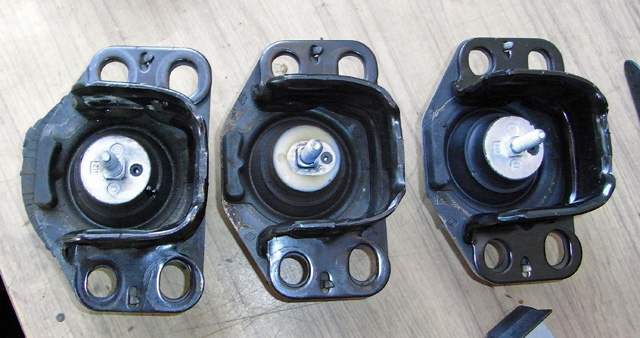 ここでは仮に以下のように呼ぶことにしますね。 ・初期の対策前のマウント= A ・最初の対策品 = B ・2度目の対策品(現行) = C 写真上では、 一番奥が、A。 左が、B。 右が、C。です。 写真下では、左から A-B-C の順に並べてみました。 新品時の寸法は当然ながら同じでしょうが、使っていた期間の差で、ゴムがエンジンの重みでつぶれて、高さが変わっています。 それでは、それぞれのマウントの特徴を紹介していきましょう。 |