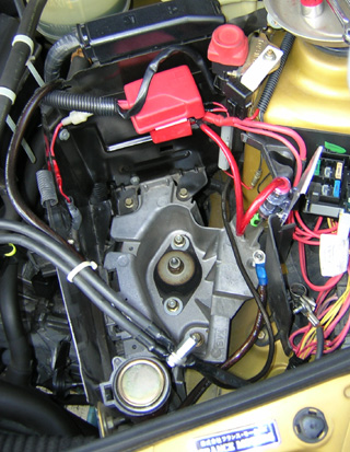 さて、交換作業に入る前に。 ミッション側マウントは写真の様にバッテリーの真下にあります。ですからまずはバッテリーをエンジンルームから取り出します。(方法はバッテリー交換の頁を参照) 続いて、マウントを外す前の下準備。 写真は省きますが前回同様マウントを外した時にエンジンが落ちないように下からジャッキで支えます。 (アンダーカバーを外してから行います) このマウントの真下あたりにミッションケースの合わせ目がありますのでそこへジャッキを当てます。ケースのどちらかだけに当てるとミッションケースがずれてオイル漏れの原因にもなりかねませんので要注意。 (ルーテシアのこの周辺のパッキン類はあまり良い代物とはいえないためオイル漏れしやすい部分です) |