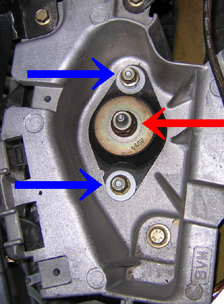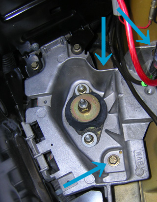 きちんと下準備をしたら、マウントを固定しているナットを緩めます。 青矢印は13mmです。ナットは下側から突き出ているボルトに締めこまれていますがこのボルトは共回りしないようにするためのガイドが付いてはおりますが緩めきると下に落ちてしまいますので注意。バッテリー台座の下に手を伸ばしてボルトを受けるようにして緩めていきます。 赤矢印は18mm。ミッションケースに取り付けられているブラケットから上向けに伸びているボルトに締めこまれています。 次の項で説明しますが、この状態ではナットは完全に取り外さず少し緩めた状態で残しておきます。 |