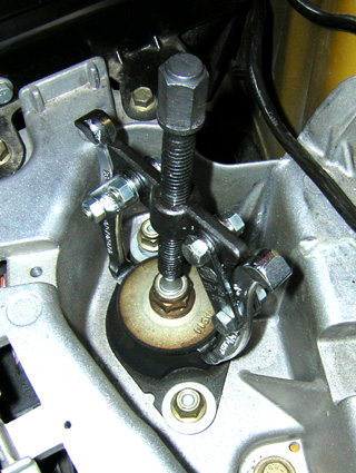 前項の赤矢印のボルトはテーパーになっていてマウントに噛みこんでいます。そのためナットを外しただけではマウントを取り外すことができません。 取り外すためにはギアプーラーを使います。(写真はホームセンターなどで¥2K程度で購入した安物ですが。^^;) マウント頂部の金属プレートの下に若干「返し」になっている部分がありますのでそこへプーラーのツメを引っ掛けて、、あとはプーラーのボルトを締めこんでいくと「ポンッ」と噛みこんでいたボルトが抜けます。 ナットを残しておいたのはこの時に下準備の時に支えとして設置したジャッキの上げ具合が足りずに、ミッションがズドンと下へ落ちてしまわないようにするため保険としての措置なのでありました。(種明かし) マウントのボルトが抜けたらナットを外す前にジャッキで高さを丁度良い位置へ調節します。 そして赤矢印ナットを緩め、マウントを取り外します。 |