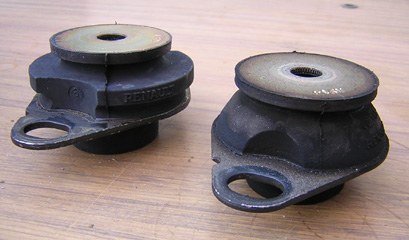 先日「エンジンマウント交換」のレポートをいたしましたが、エンジン側を交換したおかげで反対側(ミッション側)のマウントもいかれていることがリアルにわかるようになりました。(苦笑) なのでミッション側マウントも交換することにいたしました。 まず左の写真がそのマウントです。お値段は6K弱。消耗品としてなんとか認められる価格ですな。(本国価格はいくらなんだろ??) |