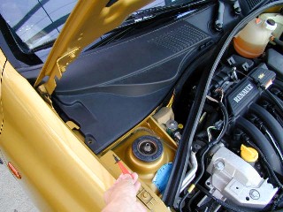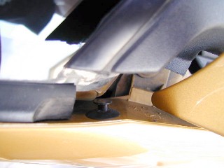 この写真はボンネットヒンジの横から覗き込んだアングルからの撮影です。 ご覧のようにカバーの切り欠きがフェンダー側についたピンの頭にはまっているのでここを外すのですが、壊さない程度に力と気合を入れてやる必要があります。 初めて外す時はちょっと勇気が要ります。 壊さないでね。 いつも書いていますが問題が生じても当方は責任を負えませんので。よろしく〜。 |
