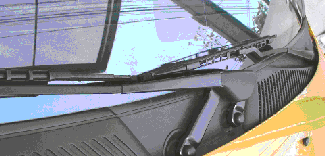どのような対策をしたのか? 1・助手席側のブレードを520mmのものから、より短い420mmのものに代えてブレードが掻く水の量を減らして跳ねを抑える。 2・短いものに代えることによってブレードに溜まる水の量も減り、したがってチョロチョロも減るという効果を狙う。 3・アームの首振り角度を大きくし(アームを曲げる)風圧のかかる方向を変えてチョロチョロを助手席側に行くように調整。 (以上左図参照) ただし曲げ加工は結構大変。まずワイパーアームをはずすのにプーラーが要りますし、曲げるのは多少のコツとかなりの力が要ります。私は万力で固定してプライヤーで「根性曲げ」をしましたが。傷がつかないようにゴムを巻いていたのですが少し塗装がはがれました。 ペイントマーカーでちょちょいと塗って終わり。ですがね。(笑)曲げるときにどうしても捩れがおきるのでそれを修正するのも何度も何度も現物合わせです。 |