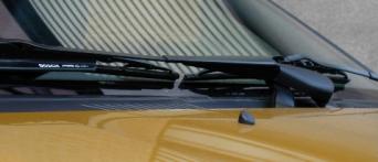 ルーテシアのワイパーは左ハンドル用のものがそのまま付いています。したがってワイパー作動中に助手席側のブレードによって跳ね飛ばされた雨水が目の前に飛び込んできて視界をさえぎったり、作動してない時にその先端から拭き残した雨水が運転席前に風圧でチョロチョロ流れてきたりすることがちょくちょくあります。 写真は対策&加工後のものですが、皆さんのルーテシアと比べてみてください。 運転席側と助手席側のブレードがオーバーラップしていないのがわかりますね。 それに助手席側アームがカーブを描いています。 |