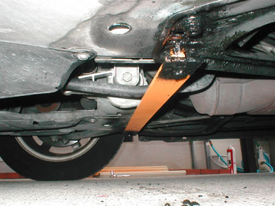 さて、今回使用したのはこのような鉄製のステーです。 市販品はパイプでできていますがCI□Q製のものは両端がピロボールリンクで接続されており、これはある程度は力の逃げがあった方がいいという判断からそうされているものと推測。 鉄ステーなら突っ張り方向には高剛性ですがたわみ方向へは逃げが発生するので丁度いいかなあってなエエ加減な発想からでた産物です。 *ホームセンターで810円で購入。(見たらわかりますワナ。。(笑)) これを金ノコで切断して取り付け穴をあけ、フロントサブフレームとボディを接続する補強プレート固定ボルトを利用して装着。左右に梯子状に「つっかえ棒」を渡すことでサブフレームの補強の役目をはたす。っつー訳でございます。 |