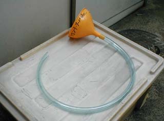 古いミッションオイルを抜いたら、新しいオイルを入れるのですがそのためには専用工具が必要です。 今回私が使用したのは、贅沢にも新規に購入したホースを装着した20年前に購入しフロンテクーペの2スト エンジンオイル注入に愛用していた漏斗です。 なんと制作費に100円もかかっています。(爆) (漏斗本体は20年以上経過しているため減価償却終了。←アホ) FR車など上から注ぐことができない場合はリフトアップして下からサクションガンで圧入する必要があります。 |