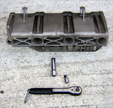 何といっても一番うっとうしいのは、この赤で囲った部分にあるインジェクター保護の鎧ですね。 前方から衝突した場合にインジェクタから燃料が噴出しないようにするための安全装備なのですが これがあるおかげで、オイルフィルターやオイルレベルゲージへ非常〜〜に手が届きにくいわけです。 で、オイル交換の時だけ外しちゃえば作業は楽になるのですが、ちょ〜っとややこしい。 前方の穴の奥底にこの鎧を固定しているナット(エンジンの種類によって 10か13mm)があるのですが、普通の3/8sq(9.5mm四角)のラチェットと10・13mmディープソケットでは届かない〜。 かといってエクステンションバーを繋ぐと隙間が狭すぎて入らない〜。と帯に短したすきに長し状態なのであります。 |