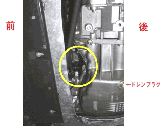 この図はエンジン前端部とフロントクロスメンバー(フロントバンパー側)の間を見上げたところです。 |