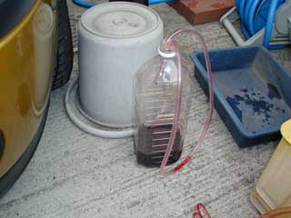 こんな感じでフルーイドは自然に排出されていきます。 ホースが短かったのでバケツの上にペットボトルを置いて自分のミスをごまかしています。(笑) |