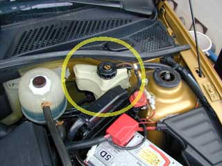 まず、パワステフルーイドのリザーバータンクの位置ですが、この丸の中にある樹脂製のタンクがそれです。 |