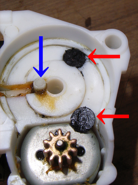 ギアを外して内部を検証。 青矢印が先述の、ギアの回転をロックレバーの伸び縮みに変換する機構です。 で、な、なんと、どうして付いているのかわかりませんが、ゴムの「ブッシュ」が白い樹脂ギアケースに装着されていました。 そのブッシュがグリスで膨張して、ロック・アンロックの際に回転するギアがスムーズに動かない状態になっておりました。 (赤矢印の分断されたゴム片) |