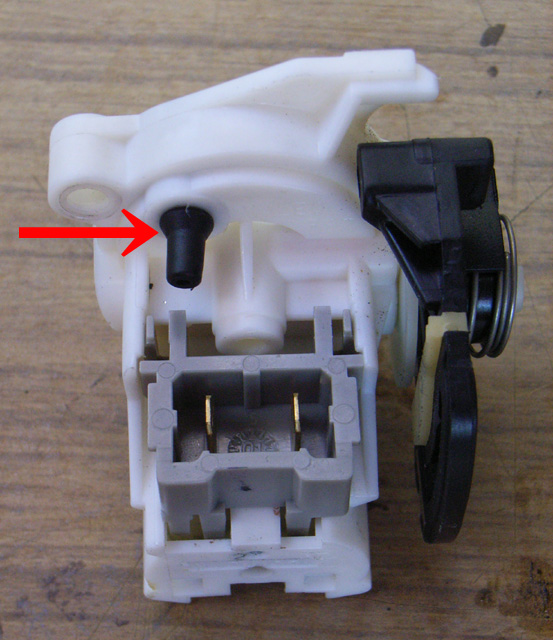 問題の膨張したゴムの裏側。 なんのことはない。単なるゴム栓でございました。 ここからグリスを入れたのだろうか? とか、いろいろ考えましたが意味不明〜〜(笑) その下、グレイの樹脂パーツが、コネクタとマブチモーターの端子を接続するアダプタです。 グレー部品の写真上側のロックピン両側を内側にしぼると取り外せます。 |