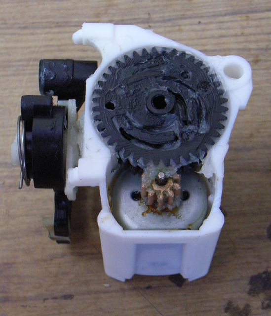 | あとは、元通り組み付けるだけです。 駆動部分やギアの歯の接触部分、ケースと歯車の接触面などなど、樹脂を犯さないシリコングリスを塗布しまくって再装着。 1回目の修理の際は、このゴム栓破片に気づかなかったのでほんの何日かでまた作動しなくなったのですが、このレポートのようにキチンと処置を施したところ、非常に快適に作動するようになりました。 |