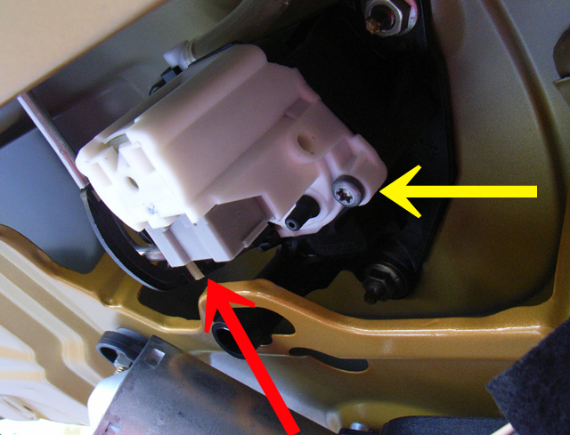 まずはロックユニットを取り外す前の画像をごらんください。 上画像は、アンロック時、 下画像は、ロック時です。 今回、この動作がうまく出来なくなってしまい、その他4枚のドアはちゃんとドアロックできるのに、ハッチのロックだけが作動しなくなったのでございます。 この部分にアクセスするためには、リアハッチの内張りのT20ビスを取り外し、スナップピンを内装はがしなどで取り外します。 すると画像の様に作動部分が丸見えになります。 下に見えているのはリアワイパーのモーターです。 |