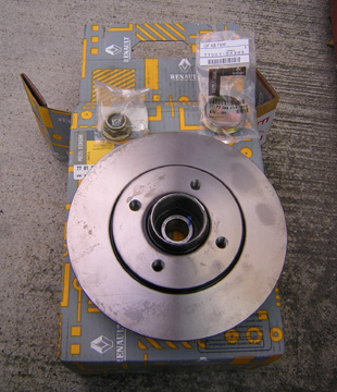 これが交換する部品です。 下に敷いている箱にローターが2枚一組で入っています。 左上はハブを固定するロックナットです。左右各1個ずつ必要です。 右上はナット部分から水や異物が浸入しないようにするためのウエザーストリップカバーです。本来新車の状態から付いているべきものなのですが、、、ラテン的というか何というか、付いている車両とついていない車両があるそうです。 もし貴方のRSにこれがついていないなら悪いことは言いません、早めに購入して装着しておくことをお勧めします。これがあるとないとではハブベアリングの寿命がかなり違うはずです。 それではボチボチ作業にかかりましょう。 右後輪の交換作業の様子です。 |