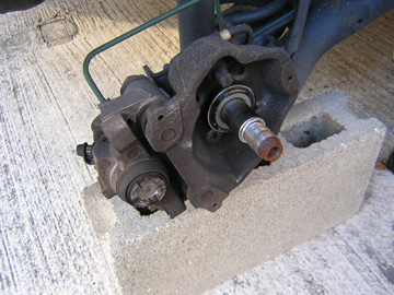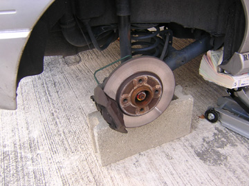 まずはジャッキアップしてタイヤを外し、リアのトーションビーム後端にブロックを置いて足回り部品を支えます。 (今回ブロックを使ったのはちょうど高さが具合よかったから。安全の為には馬をかませるのが一番です。) 車体が落ちてこないようサイドシルに馬をかませるなどの措置も安全の為に必要です。 左右前輪を輪止めで固定し、ギアをローかリバースに入れて前輪をロック。そしてサイドブレーキを解除して作業準備完了です。 |