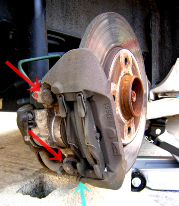 まずはブレーキパッドを外します。 <水色矢印の部分> 「ハッド」を「パッドガイド」に固定している「アングル材」のインサイド端(写真では左側)の穴に付いている「抜け止め割りピン」を取り外し、マイナスドライバーを「アングル材」のインサイド側にあててハンマーでコツコツ叩いてアウトサイドへ(写真右方向)ずらしていきます。 このアングル材を抜き取るとパッドをガイドから引き抜いて取り出すことが出来ます。 ローターが減って外周部だけが残っている、所謂「王冠状」になっている場合、パッドが引っかかり抜けにくい場合があります。 パッドが外れたら赤矢印部分、パッドガイド固定ボルトを緩めパッドガイドを取り外します。(ルノーにしては珍しく17mmレンチ使用でした) |