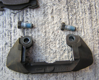 | 外れた部品。 写真左の左上が「割りピン」 その下が「アングル材」 右はパッドです。再取り付けする時にインサイド・アウトサイドを間違わないように注意。 写真右は、パッドガイドと固定ボルトです |