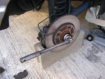 いよいよローターを外します。 ハブナットを緩めます。レンチサイズは30mm。 かなり硬いので気合を入れて緩める必要があります。 リアサスの下に支えを設置するのはこの時のためです。 支えなしでこのナットを緩めようとすると車がでんぐり返しになって自分の方へ倒れて来る場合があります。最悪の場合貴方は下敷きになりあの世行きですので・・・この作業はやめておいた方がいいでしょう。(−−; くるまいじりには絶えず危険が伴います。 |