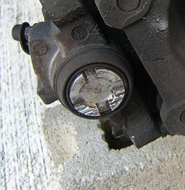 さて続いて、新しいローターを装着するわけですが、新品のローターと使用済みローターでは厚みが違いますのでそのままではブレーキパッドがはまりません。 なのでリアブレーキのピストンを押し込みます。 押し込むと言ってもフロントのようにそのまま押し込んでも引っ込んでくれません。 十字に入っている切込みに専用工具をあてがい時計回りにねじ込むことでピストンは引っ込んでいってくれます。 専用工具が無いのでラジオペンチで回しました。 ただし、工具が滑ってピストン周囲のブーツを破ってしまってブレーキフルードが噴出しても知りません。責任はとれませんのでこの方法は絶対真似しないように。 これが済んだらローターを装着します。 |