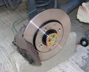 ローター装着・パッドガイド装着・パッド装着が完了したらハブボルトを保護するウエザーストリップカバーをプラスチックハンマーでコンコンと丁寧に打ち込み装着します。 美しい〜〜〜♪ 光り輝いております!!^^ 走行前に必ずローター表面をブレーキクリーナーで脱脂します。 そして、ブレーキペダルを何回も踏んでハッドとローターを密着させます。 これをやらないで走り出したらブレーキが効かず事故を起こします。絶対忘れてはいけない作業です。 |