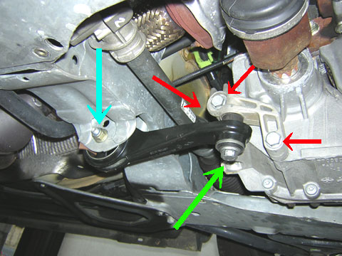 では、件のブツを取り外してみましょう。 水色矢印(大端部側)は表裏から16mmレンチでボルトナットを取り外します。 黄緑矢印(小端部側)は18mmレンチ使用。 この2本のボルトを取り外すとトルクロッドは外せます。 それから赤矢印は、黄緑矢印のボルトが固定されている「鋳物のブラケット」がトルコンハウジングに装着されているボルトです。緩みがないかついでですので確認しておきました。微妙に緩んでた。 (写真で見える2本以外に上側ボルトのその奥に、上から下向きにもう一本ボルトが刺さっています。) |