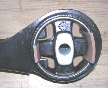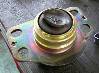 まずは、無償交換していただいた部分からご覧いただきましょう。 見慣れた人には見慣れた光景。(笑) 液体封入式エンジンマウントの裏側ゴム膜がバビバビ。 更に液が噴出した勢い(?)でゴムが’むにゅぅ’とめくれておりました。 中はカラッカラに乾燥。 標準装着と同じ新品に(not RS用)交換していただきました。 |