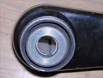 では、取り外したのと逆の順番で取り付けます。 大端部側のアップ。 挟み込んだゴム板(茶色)は両側に余りを作っておいて折り返した状態にしてみました。 これは単にゴム板の「外れ止め」の意味合いでございます。 |