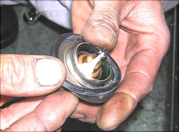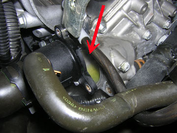 続きましては、サーモスタットのOリング交換。 吸気ダクトを外し、吸気ダクトをエンジン吊り下げフックにゴムバンドで止めてある部分のすぐ下に黒い樹脂でできたサーモスタットハウジングがあります。 写真赤矢印で示した物体。 これはM6の固定ボルト3本を緩めて取り外した状態です。 冷却液経路内にクーラントが溜まっているのが見えますね。 この中からサーモスタットを取り出し、その外周に装着されているゴムパッキンを交換してもらいました。 根本的にはサーモスタットハウジングが樹脂製だということに問題があると思うのですが。(^^; ちなみにRSは金属製。 互換性あるのかなぁ?? パッキン交換が済んだら元通り装着して冷却液を補充して完了。 |