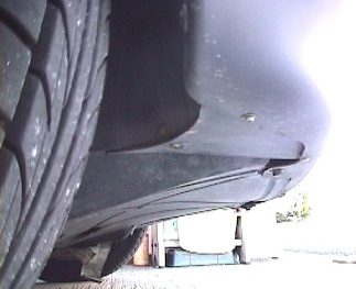 フロントバンパーの下を見上げた図です。みなさんはここを覗いたことはありますか?本来はここ、バンパー下とエンジンアンダーカバー、そしてタイヤの前のインナーフェンダーの間の三角地帯はぽっかりと空洞になっています。 |
