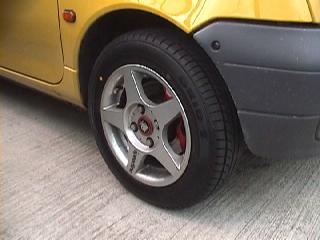 ホイールはスピードライン・ウルチモ。5.5J13 OFF33 Twingo用にセンターボアが60mmのスペーサー(5mm厚)が装着されている専用品です。タイヤはこの時はブリヂストン・GRIDU 165/65−13を履いていました。同サイズのBS・B65(現在発売の製品ははB650AQ)も装着していた事もあります。GRIDUは飛ばす時にはとてもイイ!。街中走行は乗り心地がいいB65でも十分いけてました。オーナーの乗り方に合わせてチョイスするのもいいでしょう。^^車重が軽いのであまりケース剛性の高いタイヤは避けた方が無難ですよ。 |
