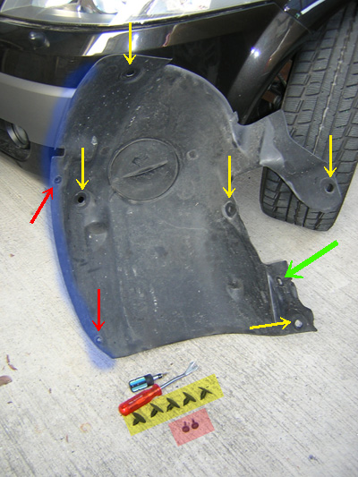 左上の写真の 「黄色矢印で示した部分」 スナップピン5本 「赤色矢印部分」 トルクスビス2本(トルクスレンチ使用:サイズ=T20) 「黄緑矢印部分」 HIDヘッドライトのオートレベライザー用コネクタを固定しているスナップピン。 これら合計7つの固定パーツを取り外します。 トルクスビス穴がある青で示した「辺」がフェンダーと接する部分です。 この「辺」の部分をフェンダーの表側へめくり上げるようにすれば、インナーフェンダーが写真のようにごっそり取り出せます。 |
