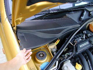 その次は右端手前のガイドにはまっている部分を外します。 ここまで外すと写真のようにこのカバーが手前にずらすことをできます。 フロントガラスを表と裏からはさみこみようになってるので無理な方向には動かさないよう注意がいります。 あとはボンネットのヒンジの後ろ側に固定されている部分を外せばカバーが取り出せます。 |